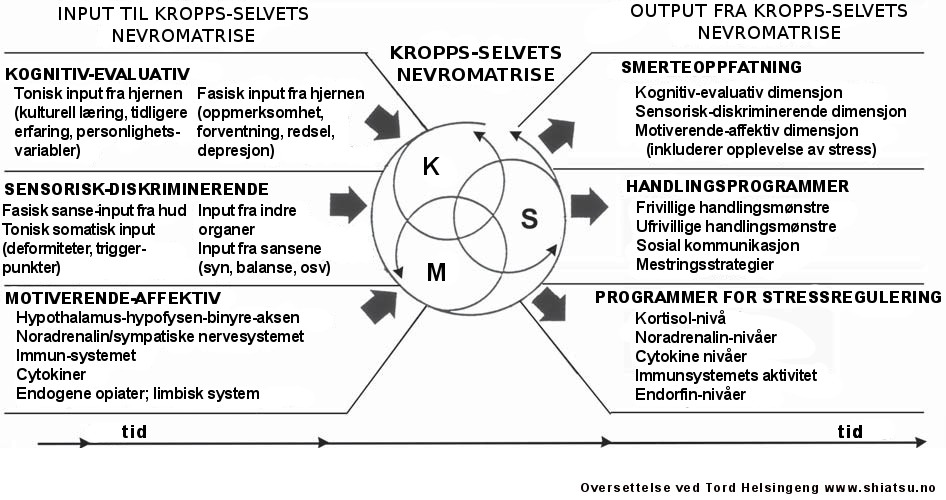 Vi skal se nærmere på en av de mest anvendelige smertemodellene som noengang har blitt utviklet, Ronald Melzacks nevromatrise-diagram (Nevro: har med nervesystemet å gjøre. Matrise: nett av rader og kolonner). Den er full av faguttrykk fra medisin og psykologi, men ikke la det skremme deg ~ forklaring følger.